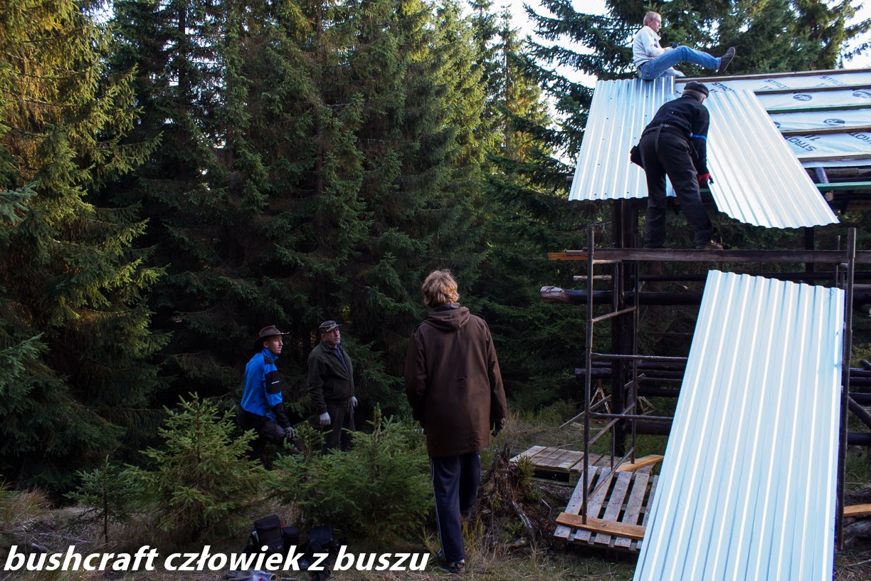 Doszliśmy do zielonej budy gdzie zrobiliśmy sobie postój. Po krótkim czasie ruszyliśmy w dalszą drogę by po pewnym czasie doszliśmy do chatki Tomaszka gdzie pomieszkuje sobie nasz przyjaciel Zbyszek-prawdziwy człowiek gór. Przy chatce zrobiliśmy dość długi popas zjedliśmy jajecznice i gawędziliśmy o różnych rzeczach. Gdy tak siedzieliśmy i rozmawialiśmy przyjechali myśliwi przysiedli się do nas i poprosili o pomoc przy budowie myśliwskiej koliby. A właściwie położeniu dachu. My bez zastanowienia mówimy pomożemy. Po paru minutach już siedzieliśmy w Nisanie Terano i ruszyliśmy w stronę placu budowlanego.
